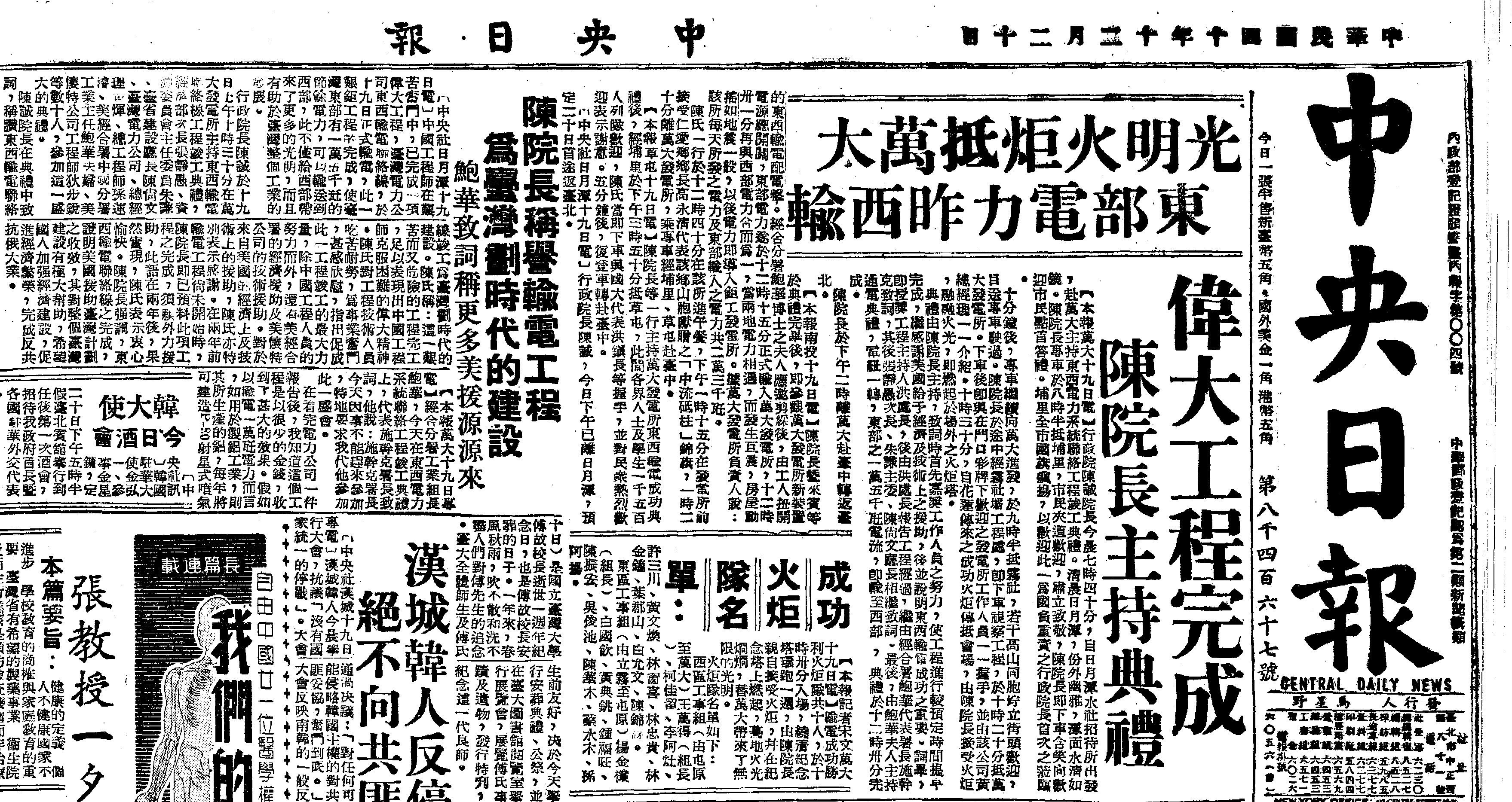 「成功火炬」抵達萬大電廠,象徵「東電西送」的計畫已然實現,當時的報紙亦將這一重大新聞消息列為頭版頭條。(圖片來源:翻攝自《中央日報》,1951年12月20日,第1版)