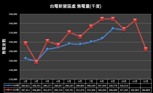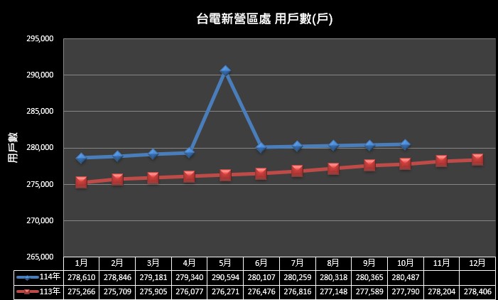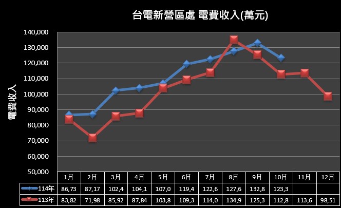 用戶數及趨勢圖 114年10月底營業區用戶數為280,487戶,其中電燈用戶272,144戶佔97.03%,電力用戶8,343戶佔2.97%。 售電量及趨勢圖 113年度售電度數為度3,744,495,286度。 (37.44億度)。 114年至10月底售電度數為2,949,475,885度。 (29.49億度)。 電費收入及趨勢圖 113年度電費收入為12,353,404,794元。(123.53億元)。 114年至10月底電費收入為11,134,588,597元。(11.13億元)。 用戶數及趨勢圖 114年9月底營業區用戶數為280,365戶,其中電燈用戶272,032戶佔97.03%,電力用戶8,333戶佔2.97%。 售電量及趨勢圖 113年度售電度數為度3,744,495,286度。 (37.44億度)。 114年至9月底售電度數為2,623,165,972度。 (26.23億度)。 電費收入及趨勢圖 113年度電費收入為12,353,404,794元。(123.53億元)。 114年至9月底電費收入為9,900,688,134元。(99.01億元)。 用戶數及趨勢圖 114年8月底營業區用戶數為280,318戶,其中電燈用戶271,992戶佔97.03%,電力用戶8,326戶佔2.97%。 售電量及趨勢圖 113年度售電度數為度3,744,495,286度。 (37.44億度)。 114年至8月底售電度數為2,294,387,279度。 (22.94億度)。 電費收入及趨勢圖 113年度電費收入為12,353,404,794元。(123.53億元)。 114年至8月底電費收入為8,571,763,753元。(85.72億元)。 用戶數及趨勢圖 114年7月底營業區用戶數為280,259戶,其中電燈用戶271,937戶佔97.03%,電力用戶8,322戶佔2.97%。 售電量及趨勢圖 113年度售電度數為度3,744,495,286度。 (37.44億度)。 114年至7月底售電度數為1,987,023,281度。 (19.87億度)。 電費收入及趨勢圖 113年度電費收入為12,353,404,794元。(123.53億元)。 114年至7月底電費收入為7,295,695,485元。(72.96億元)。 區處簡介-用戶數及趨勢圖 114年6月底營業區用戶數為280,107戶,其中電燈用戶271,789戶佔97.03%,電力用戶8,318戶佔2.96%。 區處簡介-售電量及趨勢圖 113年度售電度數為度3,744,495,286度。 (37.44億度)。 114年至6月底售電度數為1,686,923,580度。 (16.87億度)。 電費收入及趨勢圖 113年度電費收入為12,353,404,794元。(123.53億元)。 114年至6月底電費收入為6,069,451,192元。(60.69億元)。 區處簡介-用戶數及趨勢圖 114年4月底營業區用戶數為279,340戶,其中電燈用戶271,042戶佔97.03%,電力用戶8,298戶佔2.97%。 售電量及趨勢圖 113年度售電度數為度3,744,495,286度。(37.44億度)。114年至4月底售電度數為1,095,957,229度。(10.96億度)。 電費收入及趨勢圖 113年度電費收入為12,353,404,794元。(123.53億元)。114年至4月底電費收入為3,804,799,034元。(38.05億元)。 用戶數及趨勢圖 114年4月底營業區用戶數為279,340戶,其中電燈用戶271,042戶佔97.03%,電力用戶8,298戶佔2.97%。 售電量及趨勢圖 113年度售電度數為度3,744,495,286度。 (37.44億度)。 114年至4月底售電度數為1,095,957,229度。 (10.96億度)。 電費收入及趨勢圖 113年度電費收入為12,353,404,794元。(123.53億元)。 114年至4月底電費收入為3,804,799,034元。(38.05億元)。 用戶數及趨勢圖 114年3月底營業區用戶數為279,181戶,其中電燈用戶270,884戶佔97.03%,電力用戶8,297戶佔2.97%。 售電量及趨勢圖 113年度售電度數為度3,744,495,286度。 (37.44億度)。 114年至3月底售電度數為807,500,357度。 (8.08億度)。 電費收入及趨勢圖 113年度電費收入為12,353,404,794元。(123.53億元)。 114年至3月底電費收入為2,763,709,976元。(27.64億元)。 用戶數及趨勢圖 114年2月底營業區用戶數為278,846戶,其中電燈用戶270,556戶佔97.03%,電力用戶8,290戶佔2.97%。 售電量及趨勢圖 113年度售電度數為度3,744,495,286度。 (37.44億度)。 114年至2月底售電度數為523,323,111度。 (5.23億度)。 電費收入及趨勢圖 113年度電費收入為12,353,404,794元。(123.53億元)。 114年至2月底電費收入為1,739,146,747元。(17.39億元)。 用戶數及趨勢圖 114年1月底營業區用戶數為278,610戶,其中電燈用戶270,317戶佔97.02%,電力用戶8,293戶佔2.98%。 售電量及趨勢圖 113年度售電度數為度3,744,495,286度。 (37.44億度)。 114年至1月底售電度數為264,622,054度。 (2.65億度)。 電費收入及趨勢圖 113年度電費收入為12,353,404,794元。(123.53億元)。 114年至1月底電費收入為867,373,039元。(8.67億元)。 用戶數及趨勢圖 113年12月底營業區用戶數為278,406戶,其中電燈用戶270,123戶佔97.02%,電力用戶8,283戶佔2.98%。 售電量及趨勢圖 112年度售電度數為度3,560,104,539度。 (35.60億度)。 113年至12月底售電度數為3,744,495,286度。 (37.44億度)。 電費收入及趨勢圖 112年度電費收入為10,545,497,927元。(105.45億元)。 113年至12月底電費收入為12,353,404,794元。(123.53億元)。 113年11月底營業區用戶數為278,204戶,其中電燈用戶269,926戶佔97.02%,電力用戶8,278戶佔2.98%。 112年度售電度數為度3,560,104,539度。(35.60億度)。113年至11月底售電度數為3,459,825,987度。(34.60億度)。 112年度電費收入為10,545,497,927元。(105.45億元)。113年至11月底電費收入為11,368,233,135元。(113.68億元)。 更新日期:2025-11-17 瀏覽人次:11655 常用服務 電力小詞典:相關停電定義說明 1計畫性工作停電 為強化系統韌性或因設備老舊定期更換檢修設備需要而排定的停電,屬計劃性的工作停電,與電源不足完全無關。 2限電 1緊急限電 遇系統突發事故,導致電源不足或設備超過負荷、電壓嚴重偏低時,為顧及電力系統安全,需立即實施之限電措施。 2計畫性限電 前一日預估隔日電能不足,執行計畫性限電用以確保系統安全。 3事故停電 偶發性因天災外力或設備問題故障,所以引起的局部設備停電事故。