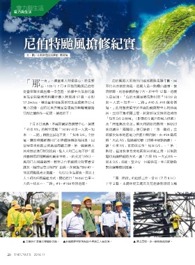 電力與生活 電力與生活 尼伯特颱風搶修紀實 文、圖/花東供電區營運處 陳冠瑋 105 7 8 17 12 57.2m/sec 161kV 78 161kV D/S #40 #41 P/S P/S 5 D/S P/S D/S #39 TBM-KY D/S 2 2 P/S P/S 1 161kV 78 #1~#164 ▲ 台電同仁準備出發搶修災區。 ▲莊副總經理赴現場勘查與施工人員合照。 ▲ 爬上高塔,逐一檢視線路問題。 20 2016.11
