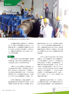 電力與生活 電力與生活 ▲ 示範電廠的維修全部由大甲溪發電廠技術人員執行。 70 20 104 30 102 102 再生 103 105 8 10 28 2016.11