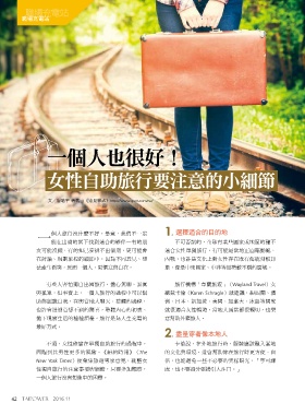 職場充電站 職場充電站 一個人也很好! 女性自助旅行要注意的小細節 文/魯皓平 轉載自《遠見雜誌》http://www.gvm.com.tw/ 1. 選擇適合的目的地 Wayland Travel Karen Schragle 2. 盡量穿著像本地人 The New York Times 42 2016.11