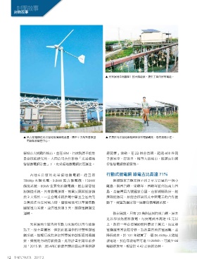 封面故事 封面故事 ▲ 光采濕地中高腳屋上的太陽能板,提供了屋內所有電能。 ▲ 風力發電機在光采濕地發揮綠能產量,圖中下方為智慧微型 ▲ 民眾於光采濕地綠能園區享受輕騎鐵馬,悠然漫過小徑。 電網能源調控中心。 IBM 22 400 78kWp 6 9.8kW 159kW 行動式微電網 綠電占比高達 71% 60kW 2 3 3 ? 20 15 101 86.4kWp 66 110MWh 2015 APEC 4.42 12 2017.2