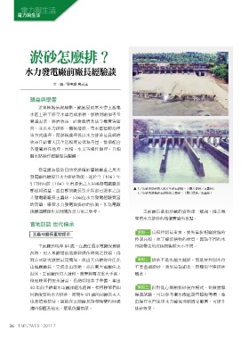 電力與生活 電力與生活 淤砂怎麼排? 水力發電廠前廠長經驗談 文、圖/發電處 鄭志達 請益與學習 106 5 104 ▲上/沉砂池排砂幾天後產生砂石淤積。(圖片提供/王灥林) 下/沉砂池淤積砂石排除後之情形。(圖片提供/王灥林) 實地訪談 世代傳承 重點一 重點二 王灥林廠長重點提示 重點三 84 40 81 36 2017.7