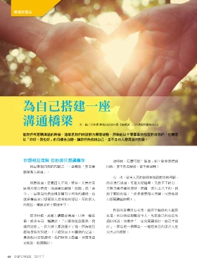 職場充電站 職場充電站 為自己搭建一座 溝通橋梁 文、圖/洪仲清 轉載自遠流出版《療癒誌:洪仲清與你書寫談心》 當我們有意願溝通的時候,通常是我們假設對方願意傾聽,然後能以平等尊重的態度對待我們,也願意 以「你好,我也好」的目標去改變。讓我們先檢視自己,是不是他人想溝通的對象。 你想相互理解 但他卻只想講贏你 44 2017.7