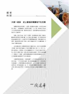 台電配售電系統過去一年頗多建樹,上半年與教育部共同完成「班 班有冷氣」,下半年則與交通部一起打拚屏鵝電纜地下化,在跨部會的 任務組織中,台電很稱職的扮演最佳配角,全力以赴讓工程都能如期 如質完成,甚至進度超前。這一次,更展現台電優異的動員能力,發揮 台電人使命必達的 DNA,以高效執行力完成史上最強的電纜地下化任 務。